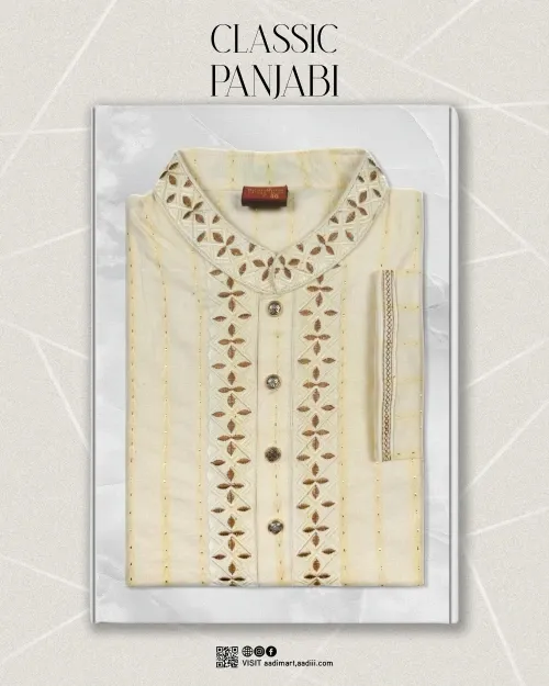 স্টাইল আর ঐতিহ্যের নিখুঁত সংমিশ্রণ নিয়ে এসেছে আমাদের ক্লাসিক কোয়ালিটির Men Embroidery Panjabi। ১০০% খাঁটি কটন ফেব্রিক দিয়ে তৈরি এই পাঞ্জাবি আপনার আরামের নিশ্চয়তা দেবে সারাদিন।